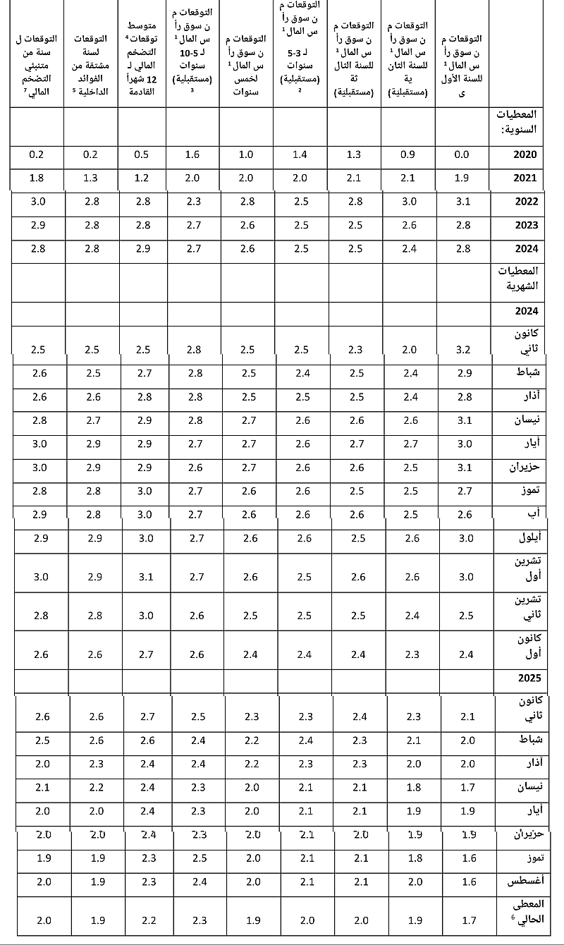 تتضمن توقعات التضخم المالي المستمدة من سوق رأس المال مكون أقساط التأمين بالإضافة إلى تعديلات مختلفة ناجمة عن الاختلافات الضريبية والاختلافات في السيولة أو عمق السوق. ووفقا لتقديراتنا في كانون ثاني 2024، فإن التعديلات على التوقعات لفترة عام واحد أكبر من المعتاد. يمكن إيجاد شرح حول كيفية حساب التوقعات عبر الموقع الالكتروني: https://www.boi.org.il/boi_files/Statistics/inflation_expectations_boi.docx