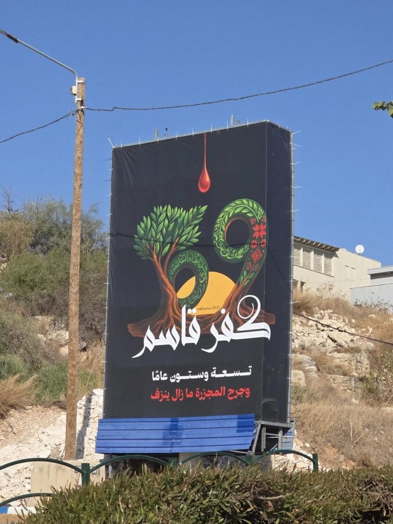 وارتدى المشاركون قمصانًا سوداء كُتب عليها: “الذكرى الـ69 لمجزرة كفر قاسم – تسعة وستون عامًا وجرح المجزرة ما زال ينزف”، كما رُفعت خلال المسيرة لافتات تحمل شعارات من بينها: “لا نسيان.. ولا غفران”.