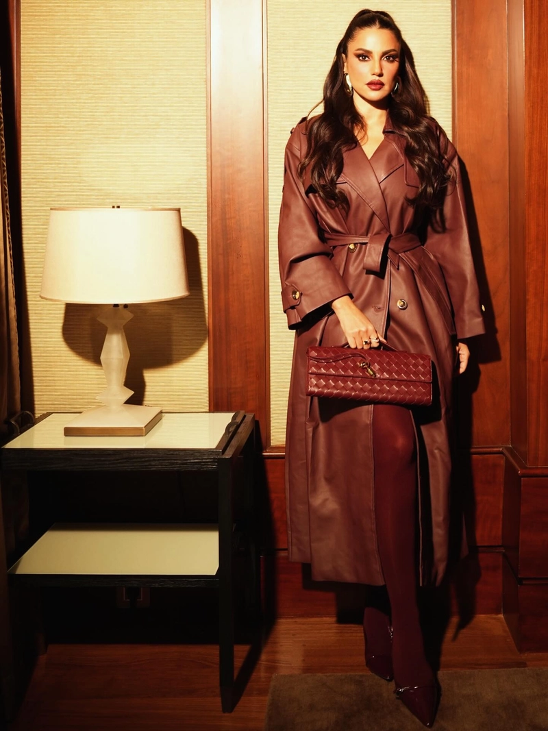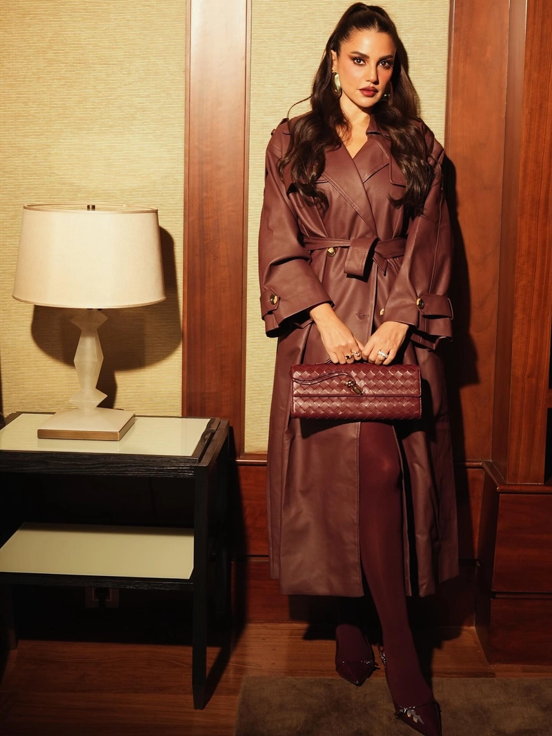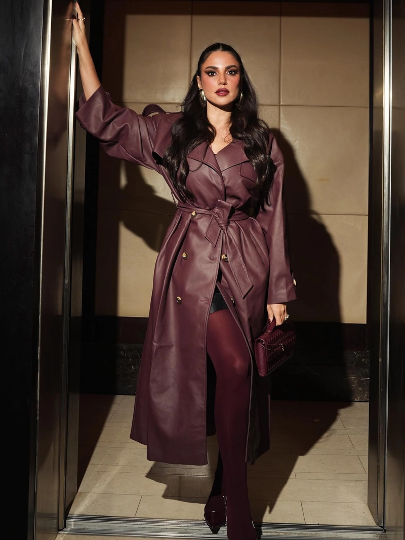 تألقت الفنانة التونسية درة زروق في أحدث ظهور لها بإطلالة خريفية أنيقة باللون البرغندي، حيث اختارت معطفًا جلديًا طويلًا بقصة واسعة وربطة خصر أنثوية.