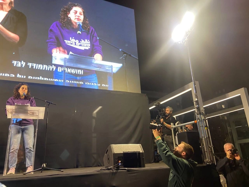أمام آلاف المتظاهرين في ساحة هبيما في تل أبيب، ألقت رلى داوود، المديرة القطرية المشاركة في حراك “نقف معًا”، خطابًا حادًا ضمن التظاهرة المركزية التي نُظمت مساء السبت في إطار الاحتجاجات ضد الحكومة.
