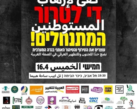 "نضع حدًا لإرهاب المستوطنين في الضفة" .. مظاهرة احتجاجية اليوم في تل أبيب| نقف معًا "لن نسكت أما الحكومة الداعمة للقتل والتهجير" تحت عنوان "كفى لإرهاب المستوطنين"...